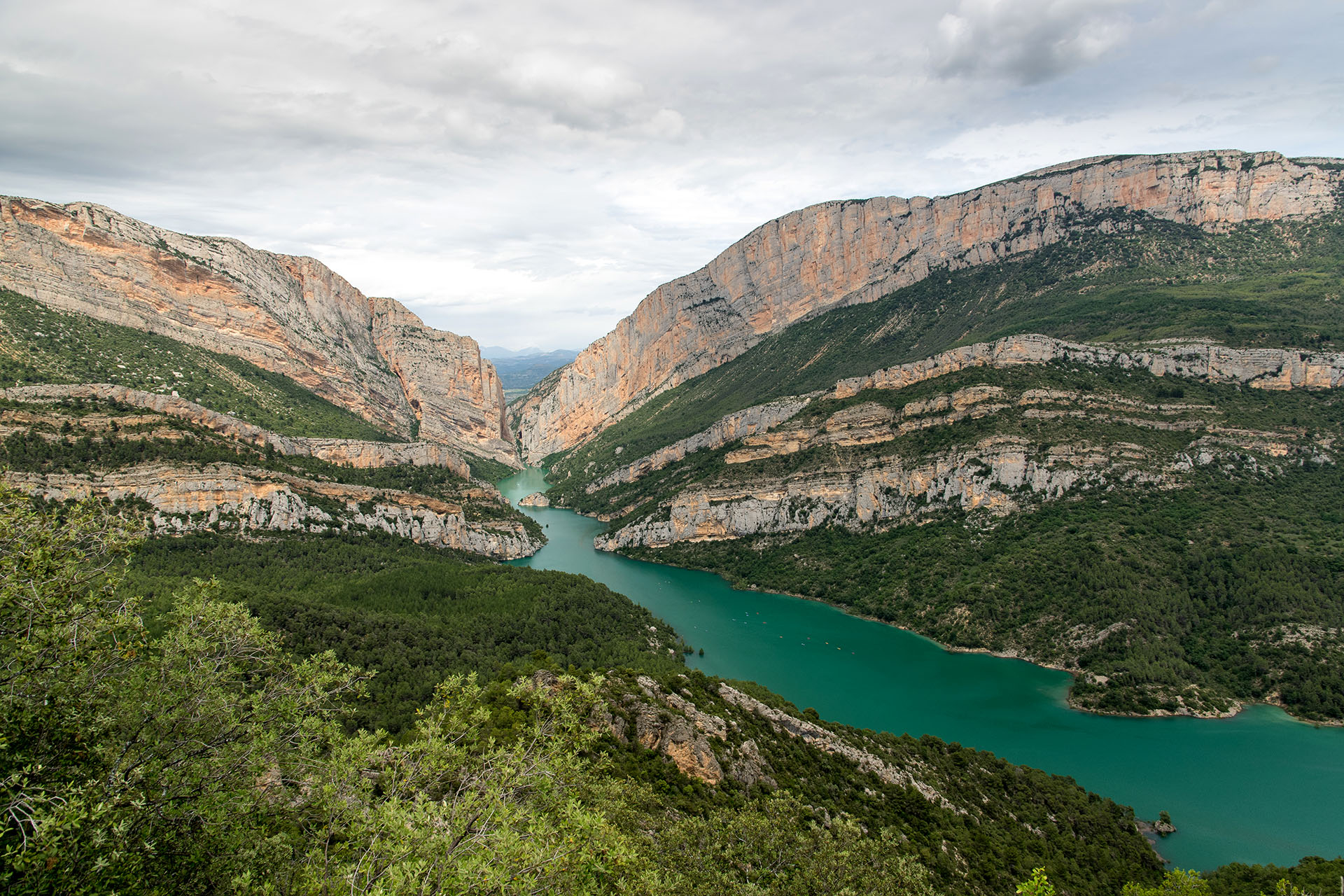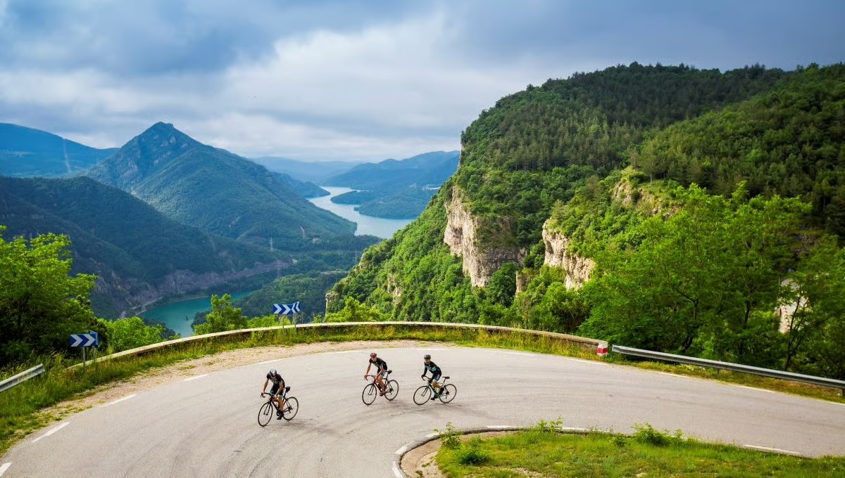 Then comes the drop beyond Àger—one of those descents that instantly changes the tone of the ride. The road carries us into the Congost de Terradets, and the scale is jaw-dropping: limestone walls rise like a fortress on both sides, their layers stacked into a cathedral of stone. This gorge is internationally known for climbing, with routes that reach up to 600 m in length—so as we thread through, you may spot climbers as tiny specks against the rock, moving on lines that seem impossible from the saddle. Source